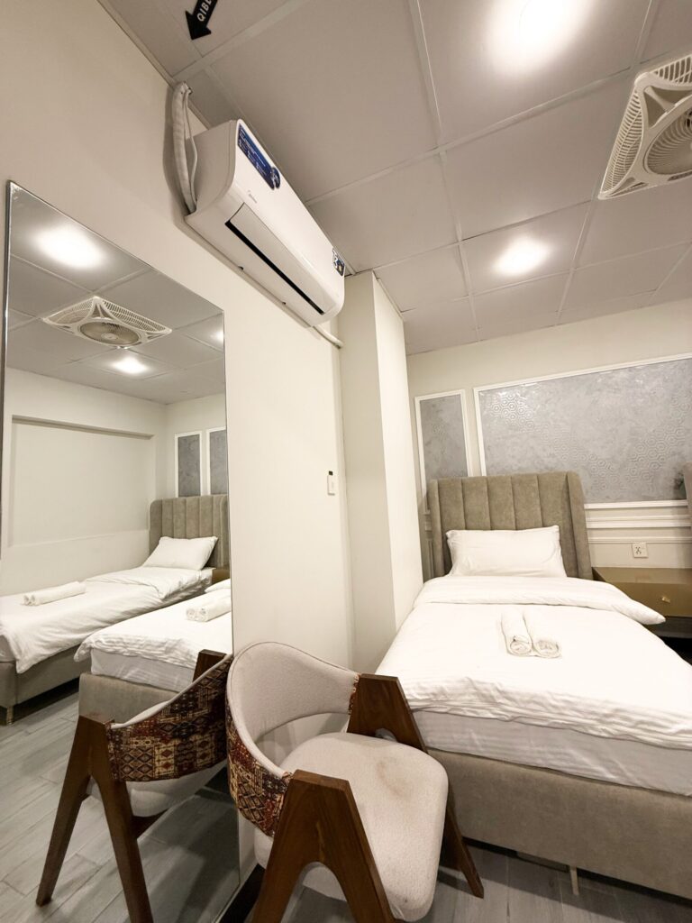 The Twin room has twin single beds. Which is suitable for the bachelor. There is also a chair and table.